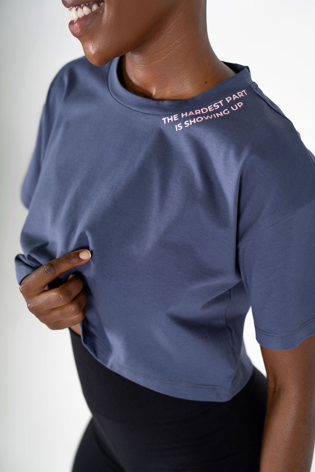 Featuring our brand logo and the empowering slogan "Showing up is the hardest part," this crop is a reminder that taking that first step, pushing through the doubt, and showing up for yourself is the ultimate act of courage.